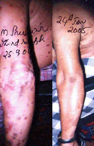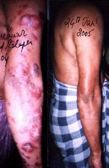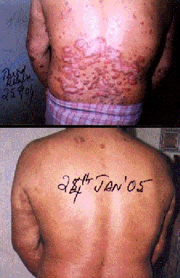 Patients should strictly adhere to a Vegetarian Diet that suites their body constitution. Some patients who took Non Vegetarian diet did not have any problems. But this cannot be generalized as I had the third relapse from august 2004 to after a remission for than two years, once I started taking non vegetarian food. Please see the following progress photo's.